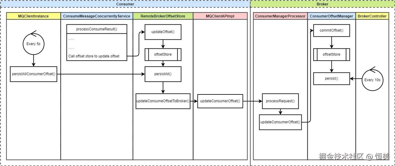 Broker 端也包含一个消费进度内存缓存表,每 5s 会收到消费者端的请求,更新内存缓存表。Broker 启动时也会启动定时任务,每 10s 将消费进度管理器的内存缓存持久化到磁盘。