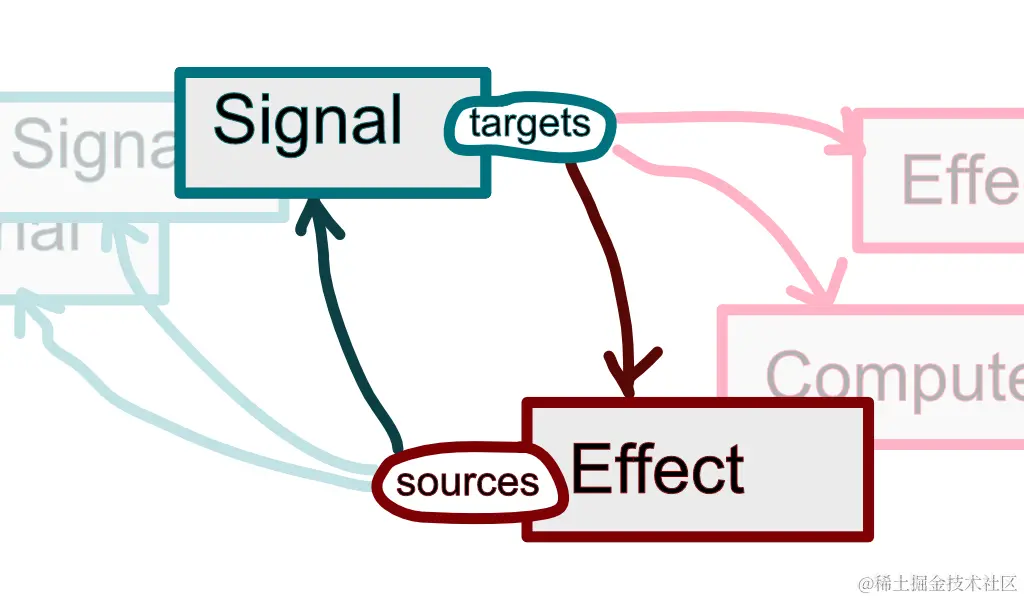 到最后,signal 和 effects 对其自身的依赖关系以及依赖者都会有个最新的试图。每个 signal 都可以在其 .value 值发生改变的时候通知到它的依赖者。例如在一个 effect 执行完成之后释放掉了,effect 和 computed signals 都是可以通知他们依赖集去取消订阅这些通知的。