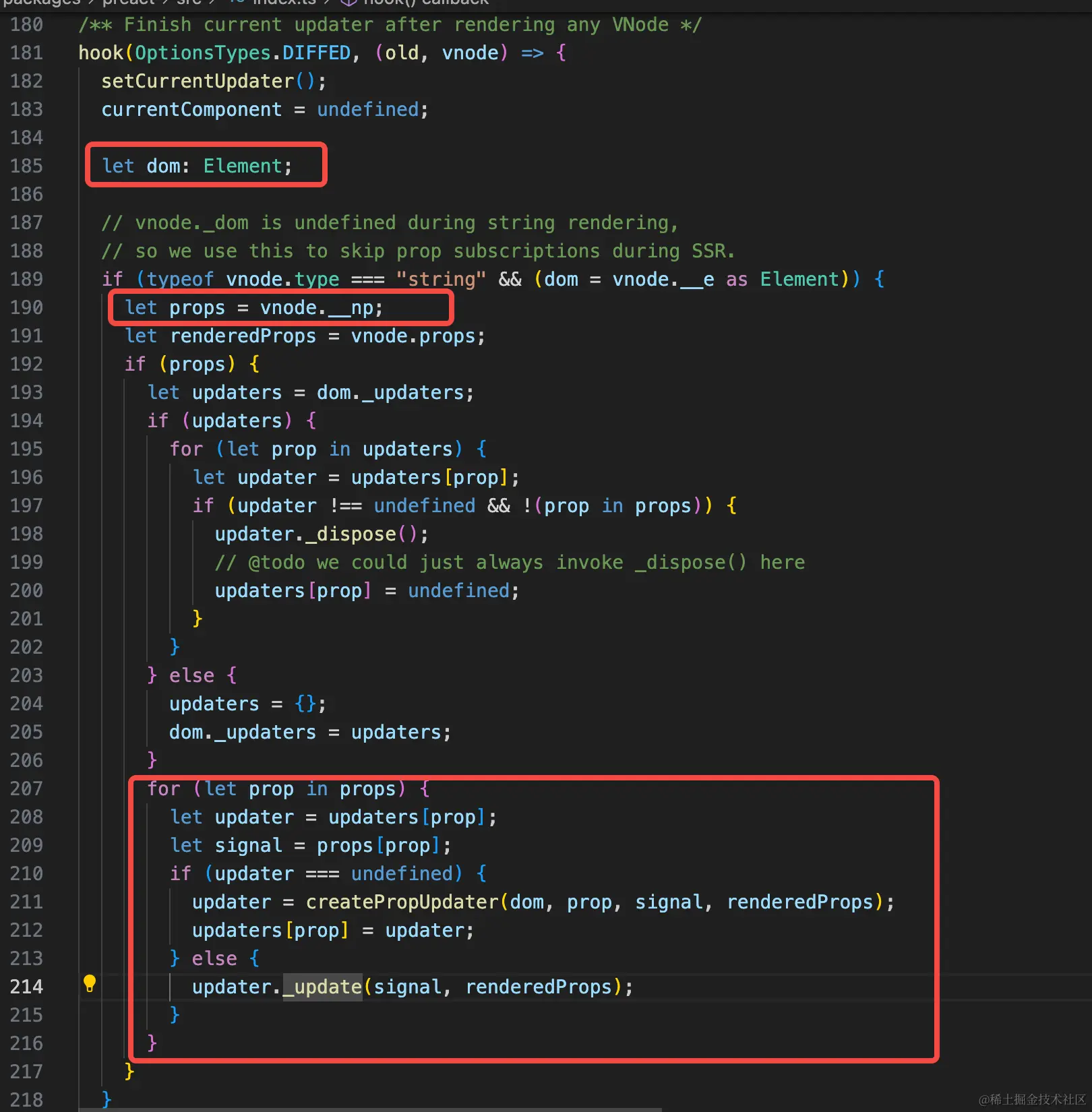把对应的 signal value 存到 vnode.__np 这个节点属性上面去,并且这里会跳过原有的 diff 算法执行逻辑(这里的 old(value) 执行函数)。