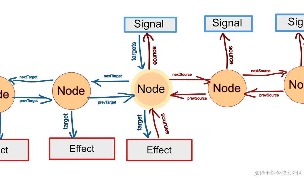 Preact 会首先给每个依赖关系都创建一个 source Node 。而对应 Node 的 source 属性会指向目前正在被依赖的 Signal。同时每个 Node 都有 nextSource 和 prevSource 属性,分别指向依赖列表中的下一个和前一个 source Nodes 。Effect 和 Computed Signals 获得一个指向链表第一个 Node 的 sources 属性,然后我们可以去遍历这里面的一些依赖关系,或者去插入 / 删除新的依赖关系。