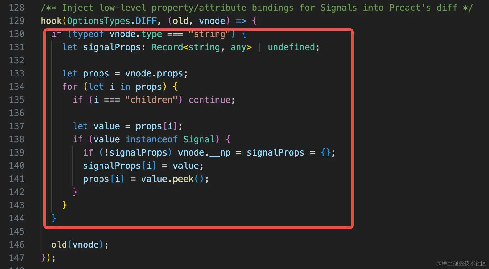 这里渲染的原理是 Preact Signal 本身会去劫持原有的 Diff 执行算法: