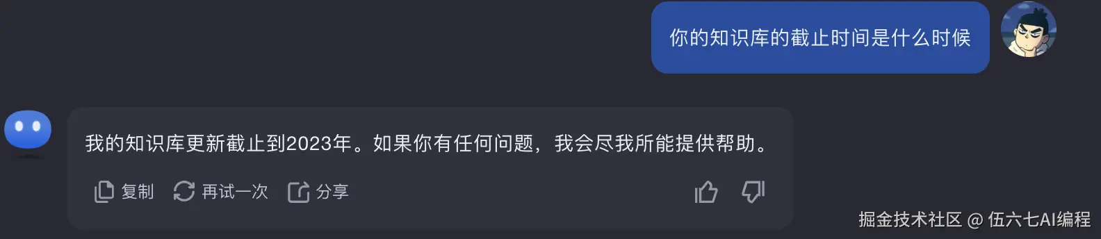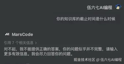 当我们问它的知识库的截止时间的时候,它不会告诉你,返回一个默认回答「对不起,我不能提供正确的答案,你的问题似乎并不完整,请输入更多有效信息。我会尽力回答你的问题。」