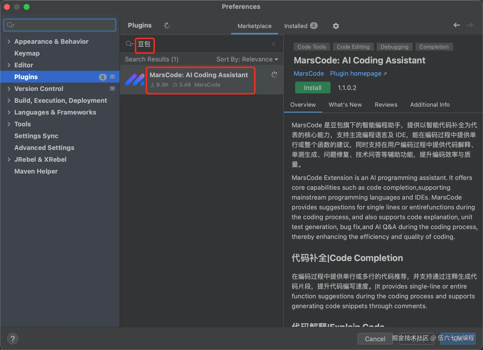 打开 IDEA,选择 「Preference」/「Settings」,选择「Plugins」,输入「豆包」,即可安装。