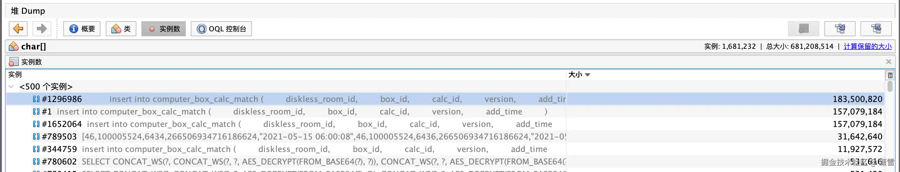然后我们通过 jstack pid 将 dump 文件导出后,通过 jvisualvm 进行进一步分析,发现某个线程一直处于执行状态,导致内存一直没有得到释放,然后定位到这个语句,发现是一个 insertbatch 操作,当遇到数量巨大的插入项,导致生成了巨大的sql语句以及数量众多的占位符对象。同时因为SQL过于巨大,MyBatis对SQL的解析也需要极长的时间,同时也占用了大量的CPU。这样就导致了其他请求的响应时间也变长,堆内存中的对象逐渐累积,导致了fullGC的发生,但fullGC在进一步抢占CPU的同时,又不能有效回收垃圾释放空间,导致频繁FullGC,系统彻底卡死。
