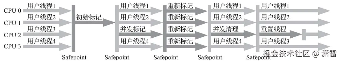 (3)重新标记:由于在并发标记阶段中,工作线程和GC线程并发执行,所以这里又需要暂停用户线程,对导致标记产生变动的一部分对象进行修正,时间非常短。