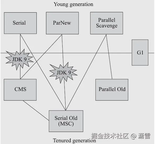 下图的连线说明它们可以搭配起来使用,其中G1是整堆垃圾收集器。