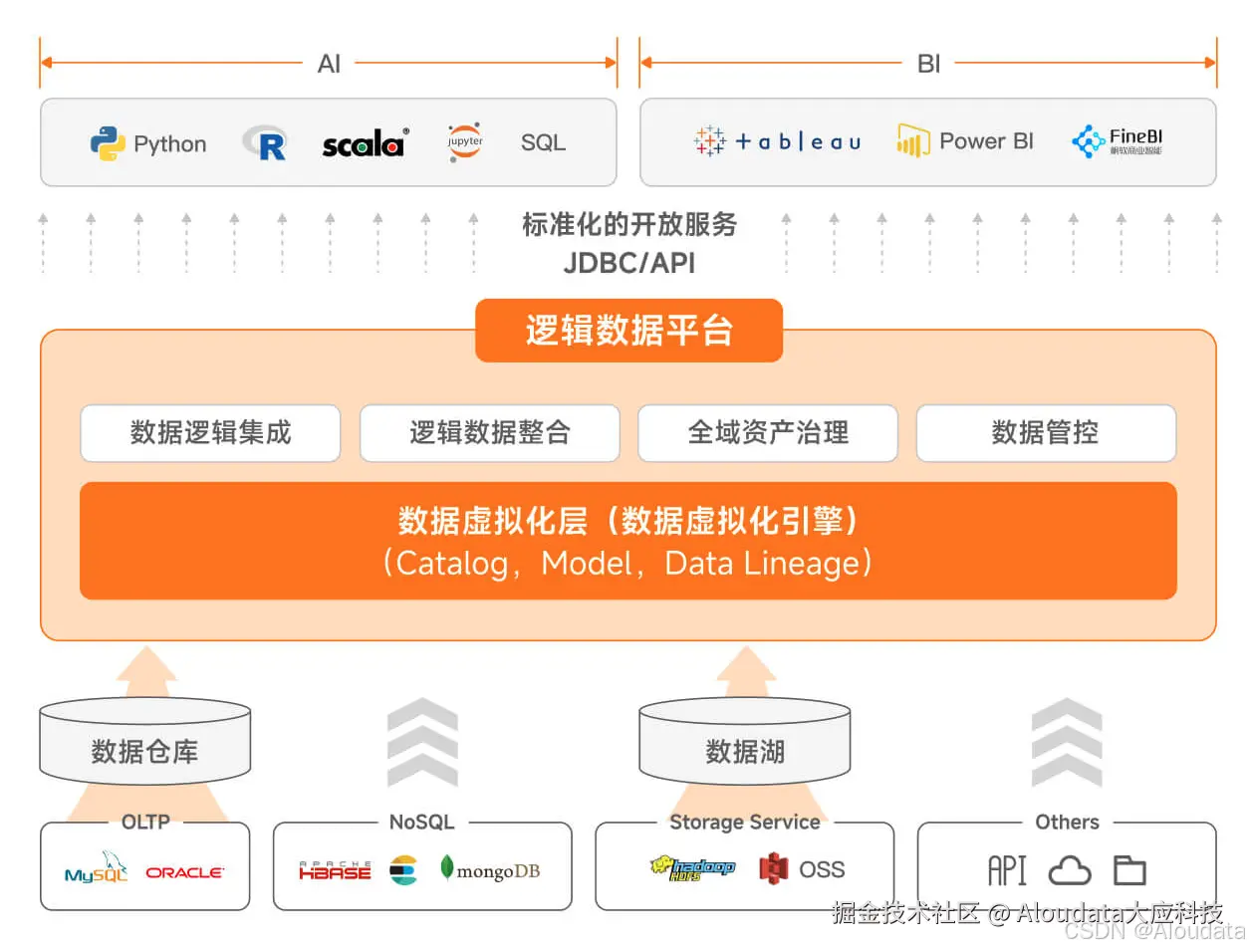 为帮助企业实现全域数据的高效、低成本集成,Aloudata 打造了国内首个 Data Fabric (数据编织)逻辑数据平台——Aloudata AIR,通过自研数据虚拟化技术,以及独有的查询下推和查询加速技术,开创了一种全新的数据整合模式,可帮助企业轻松实现离散数据在逻辑层面的高效统一集成,以极低成本沉淀全域数据资产,并提供统一的数据服务,实现统一的数据访问控制机制,让全域数据要素低成本、实时地流通与消费。