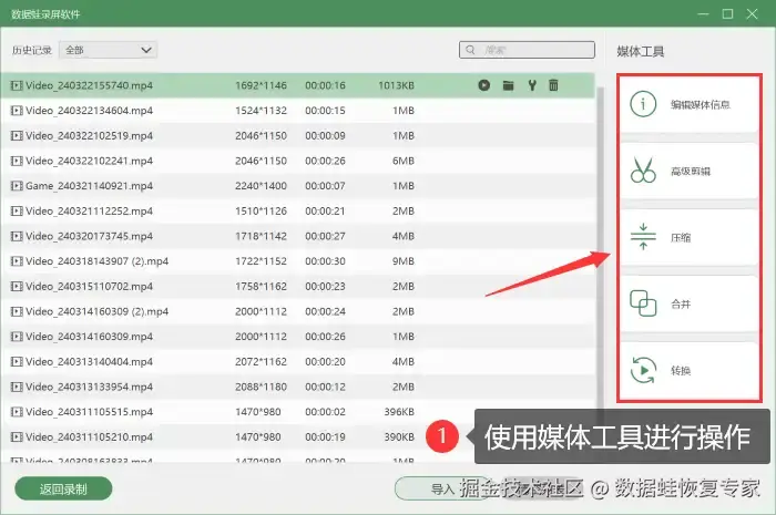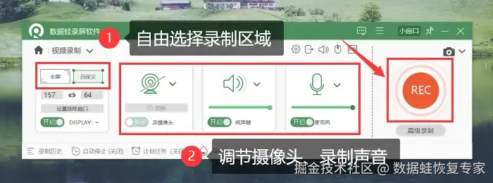 专业的录屏软件,首先推荐您使用数 据 蛙录屏软件。它不仅可以录制电脑上的任意内容,还支持多种录制模式的选择(摄像头录制、音频录制、窗口录制等),且录制无时长限制,轻松录制出高质量超长时长的录屏视频;录制完成之后,还可以对文件进行后期处理(视频剪辑、视频压缩、视频合并、视频格式转换等)。使用数 据 蛙录屏软件录制电脑屏幕的步骤如下: