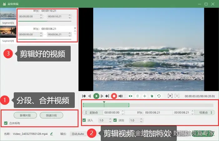 步骤4:录制完成的视频,您可以进入 【高级剪辑】 中对视频进行分段、剪辑、增加特效等,可为您去除视频中的多余部分;如果您需要更多的功能,可以在 【历史记录】 界面对视频进行压缩、合并、格式转换等操作,让您的视频更精彩更出众。