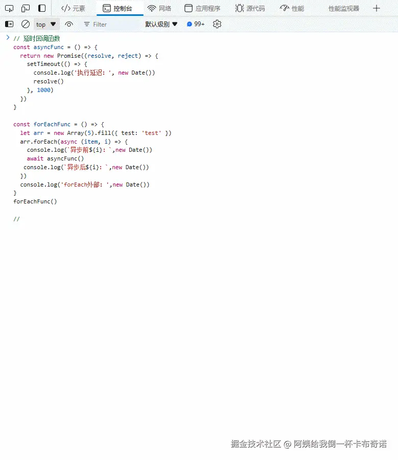 以上解释是 MDN 关于对 forEach 的部分解释,这里要注意的是,在 forEach 中使用异步是不会等待异步而暂停。所以如果不了解的小伙伴要注意一下,那就让我们做个测试。