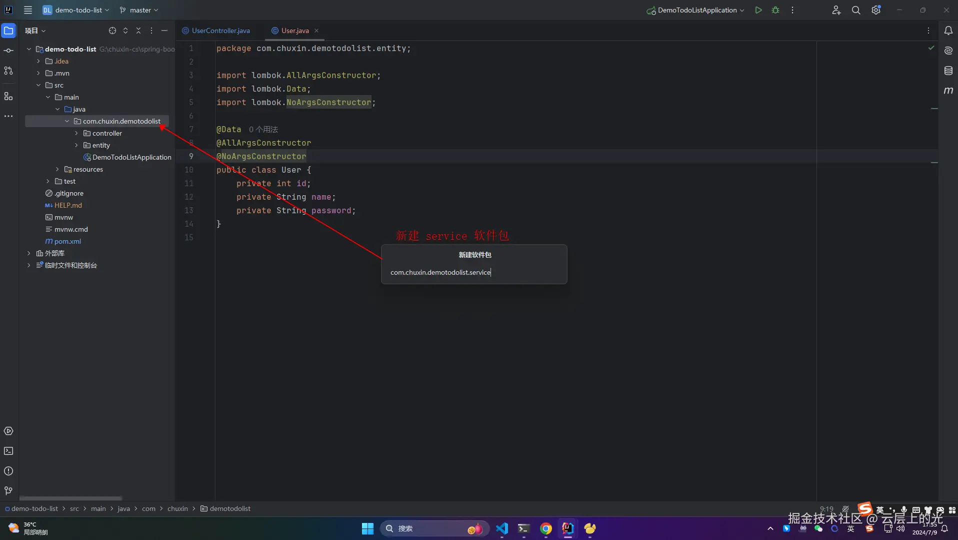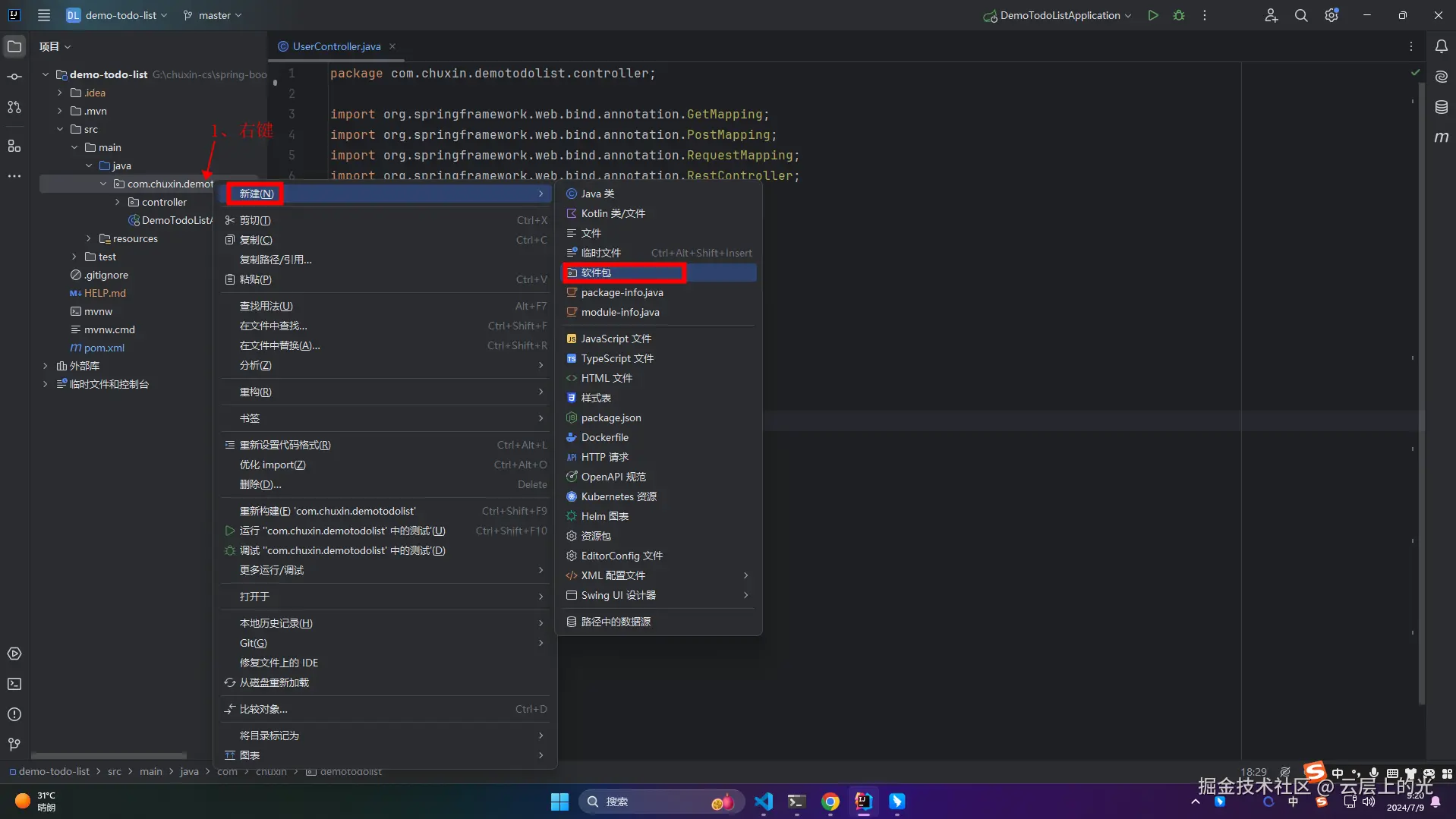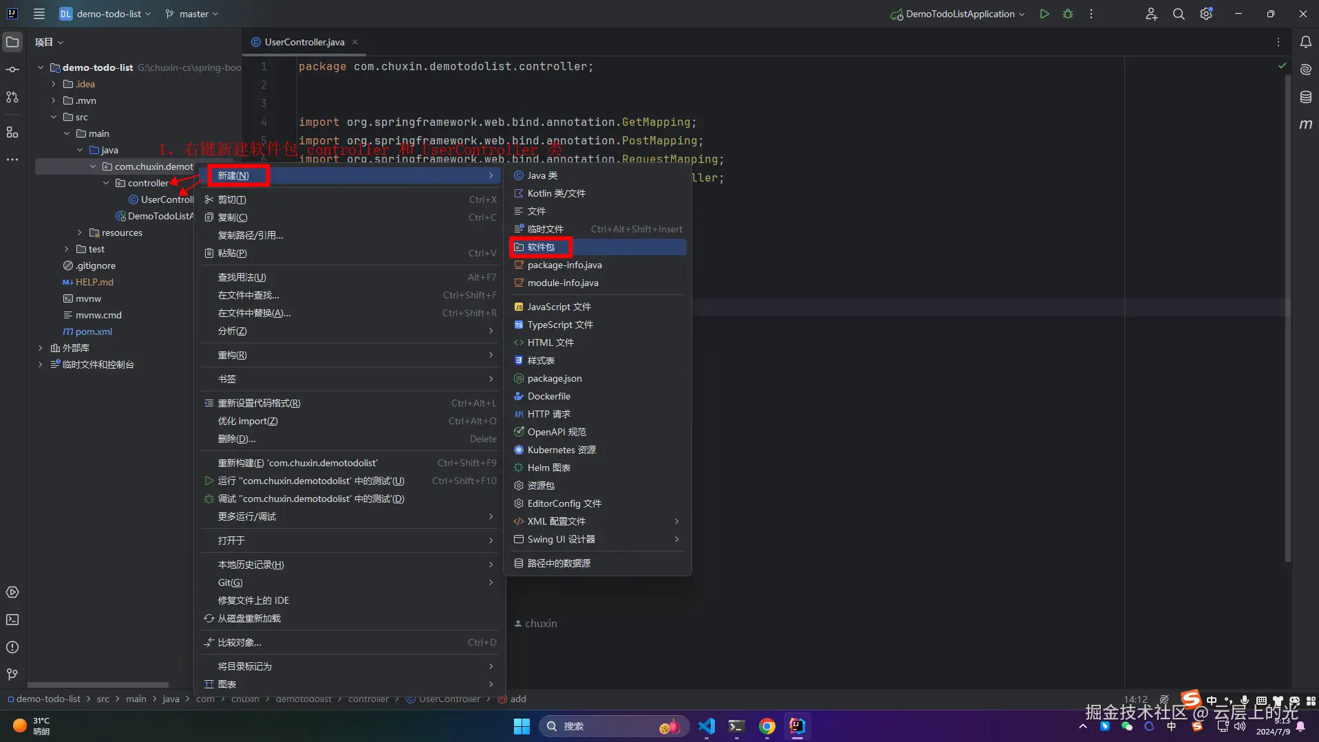 1、新建 controller 软件包、并且新建 UserController 文件类