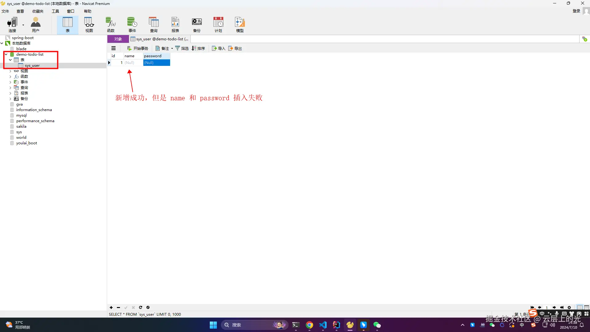 1.2、查看数据库,用户新增成功,但是插入数据失败