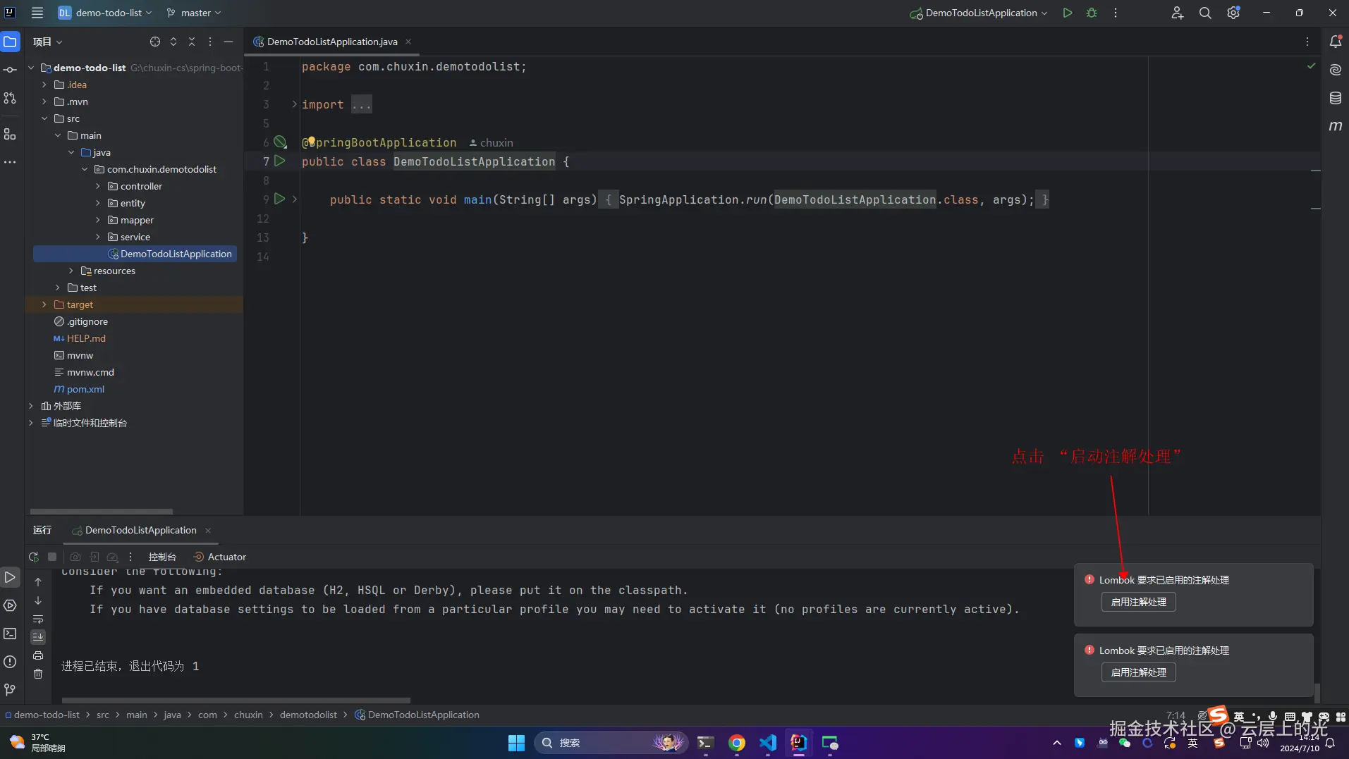 2、提示 Lombok 相关操作,点击 “启动注解处理”