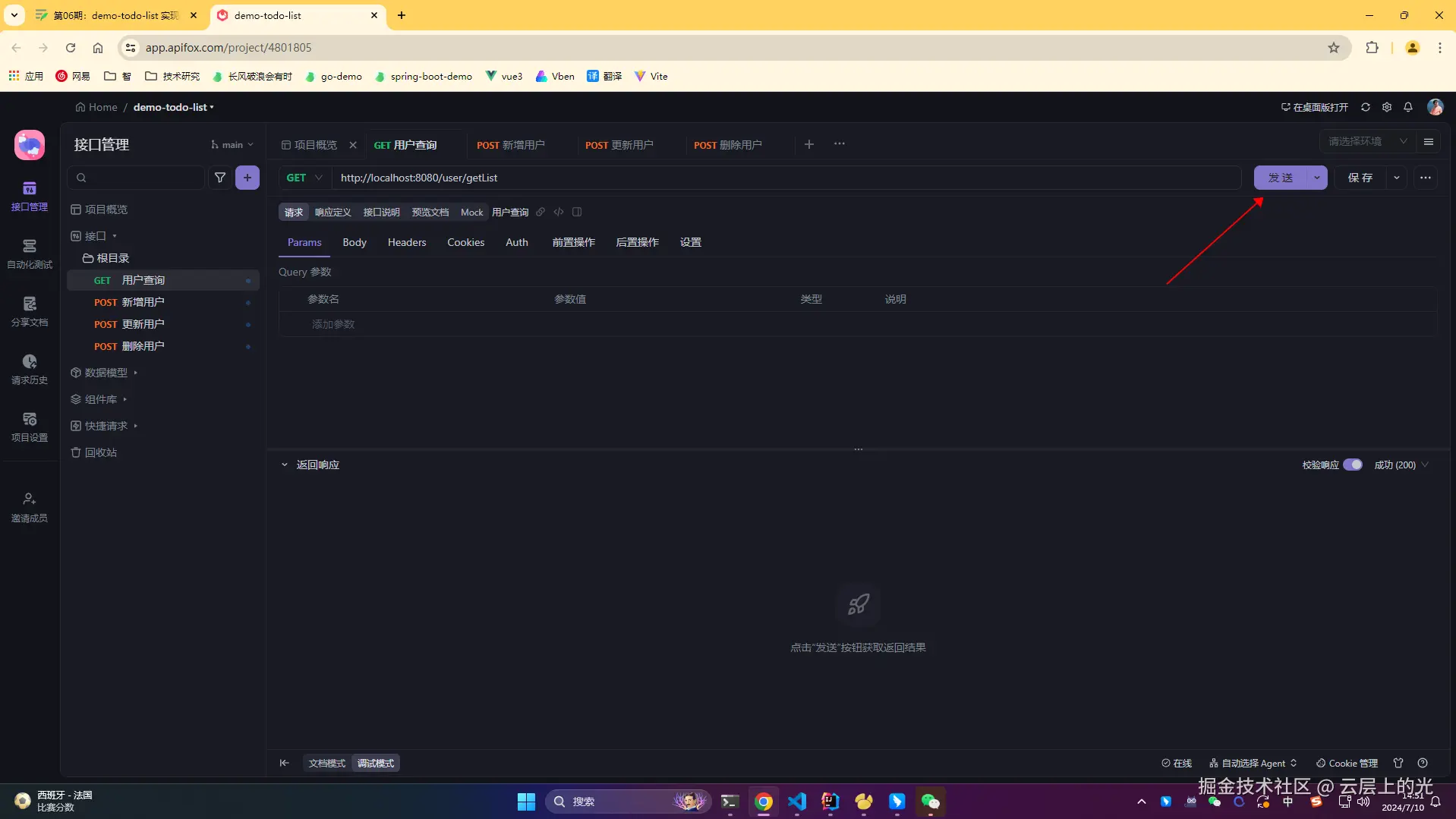 1、点击发送,调用查询用户接口 http://localhost:8080/user/getList