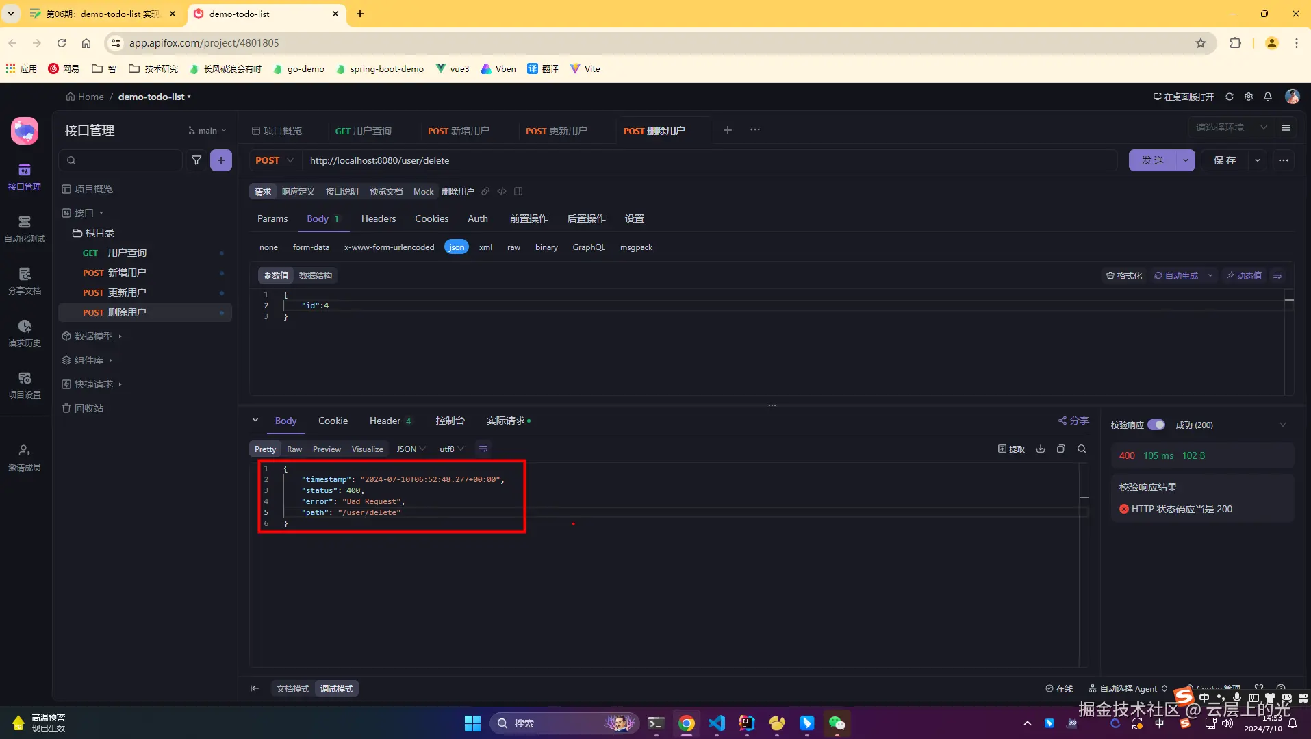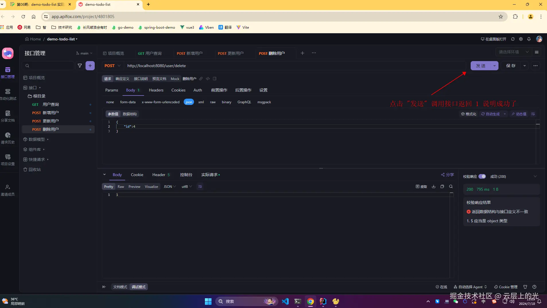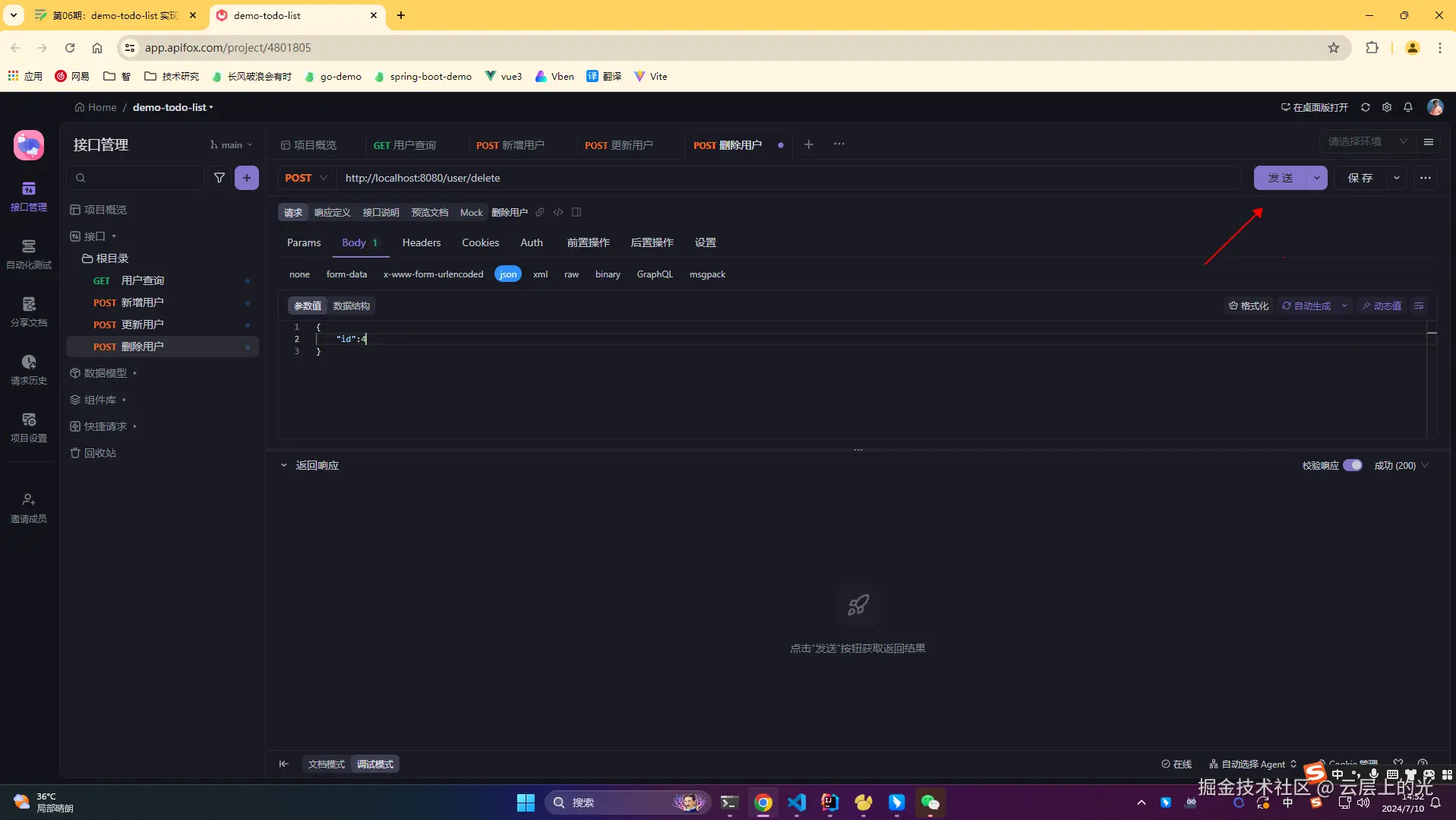 1、点击发送,调用删除用户接口 http://localhost:8080/user/delete