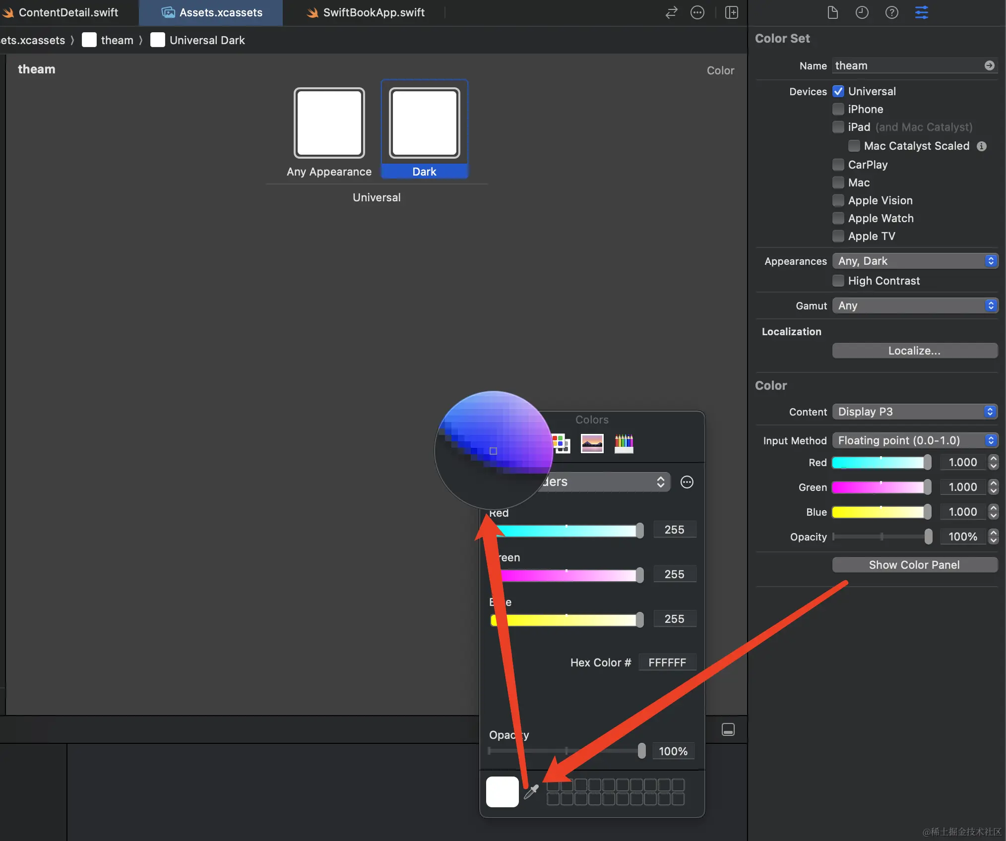 Any Appearance表示亮色模式下使用的颜色,Dark表示暗黑模式下使用的颜色
