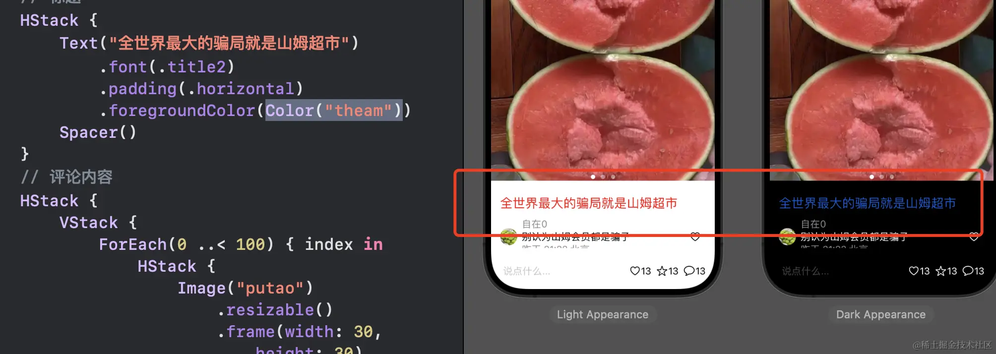 在不同的颜色模式下就会显示不同的颜色,比如我这是的亮色模式显示红色,暗色模式显示蓝色: