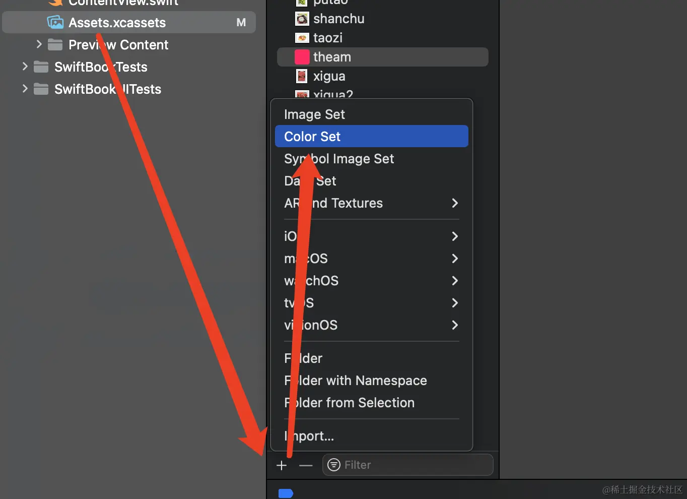 要想在xcode中使用自定义颜色或者配置主题色,需要在Assets中配置,打开Assets文件,然后点击添加Color Set: