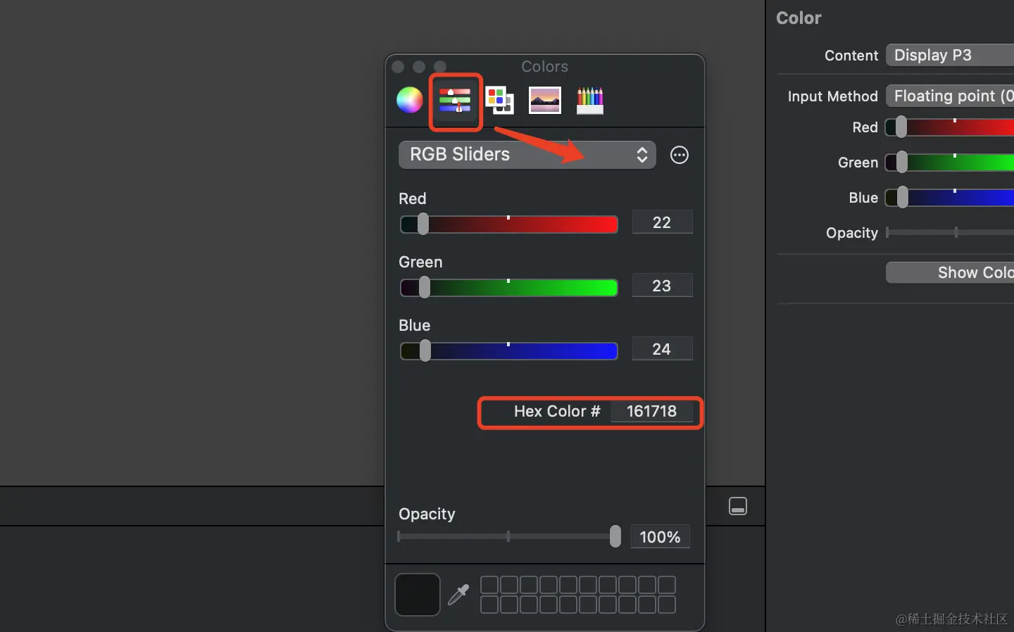 在面板里面我们可以设置颜色可以在哪些设备上使用,还有调整颜色的色值,在面板的最底部有一个Show Color Panel按钮,可以打开颜色面板,在里面可以使用吸管吸取屏幕上的颜色值: