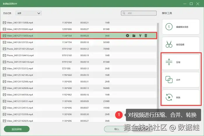 步骤4:在录制历史页面,用户可以使用软件内置的高级功能(如转换、压缩、合并等),以获得更好的视频效果。