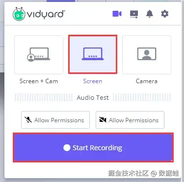 步骤2:点击浏览器工具栏中的Vidyard图标,选择 “录制屏幕” 。根据需要选择录制模式(屏幕+摄像头、仅屏幕、仅摄像头)。