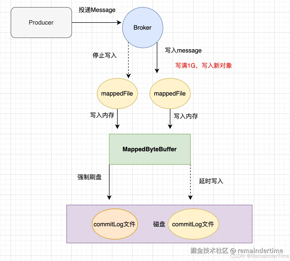 内存数据的刷盘过程本篇就不在深究,只要知道是通过MappedByteBuffer对延迟写入配置相关策略,并在设定的时期将内存数据写入磁盘文件中就可以了