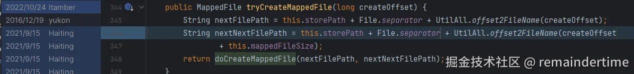 深入该方法,大概意思就是从MappedFileQueue对象中的CopyOnWriteArrayList mappedFiles;集合中取出里面的最后一个****MappedFile对象,至此赢来大结局MappedFile****对象才是最终映射到磁盘文件的,而CommitLog可以理解为MappedFile对象的外层封装。但落到磁盘上的文件我们依然称为commitLog文件