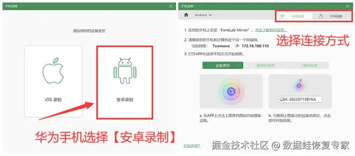步骤2:根据您的手机选择设备类型,在这里华为手机选择 【安卓录制】 ,然后选择连接方式,根据屏幕上的步骤提醒,把电脑与手机连接成功。