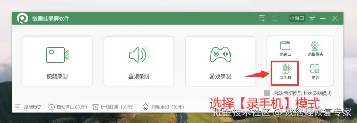 步骤1:在您的电脑上安装好 数 据蛙录屏软件。安装完成进入软件首页,选择 【录手机】 模式。