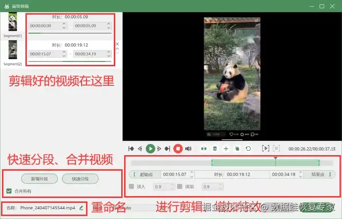 步骤4:录制完成的视频我们可以进入 【高级剪辑】 界面对其进行分段、剪辑、增加特效等操作,可以令您录制的视频更加的精彩;同时也可以对视频进行重命名,方便您将来的查找观看或者分享给他人。