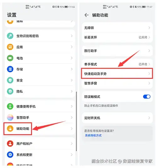 华为手机还可以使用指关节双击进行录屏。使用该功能前,需要我们打开 【设置】>【辅助功能】>【快捷启动及手势】 ,在 【屏幕录制】 中打开 【录屏开关】 。然后就可以通过指关节双击华为手机屏幕进行录屏了。