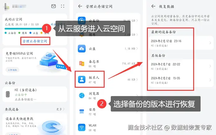 华为手机的云服务功能非常强大,可以帮助你备份和恢复手机中的数据。如果你之前已经开启了华为手机通讯录同步,那么,你就可以轻松找回你的联系人。一般来说,只需要输入账号密码登录账户,就可以进入云空间中查看备份数据。然后选择备份版本,将联系人恢复至手机本地即可。