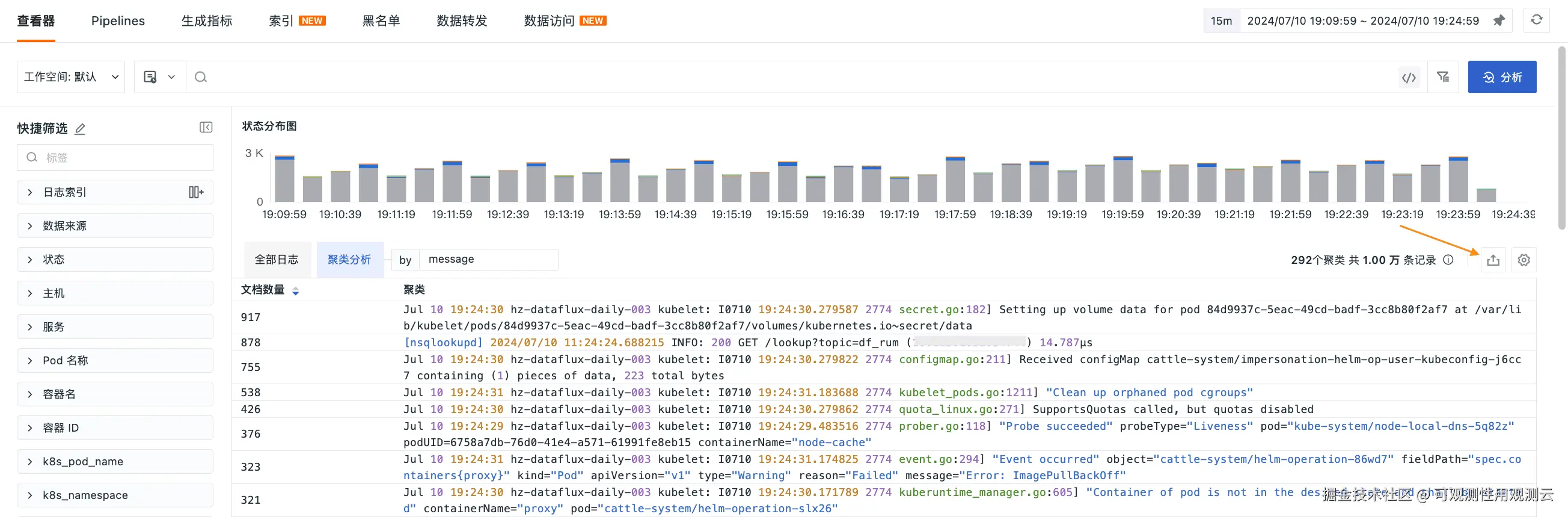 2、日志查看器:聚类分析模式下,支持导出显示列数据及关联日志页面数据。