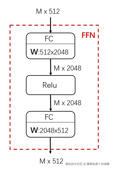 这个FFN层是一个顺序结构:包括一个全连接层(FC) + relu激活层 + 第二个全连接层,其公式可以表示为:FFN(x) = max(0, xW1 + b1)W2 + b2。