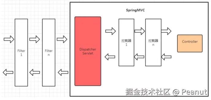 这张图很重要,其中包括了filter、dispatcherServlet和拦截器