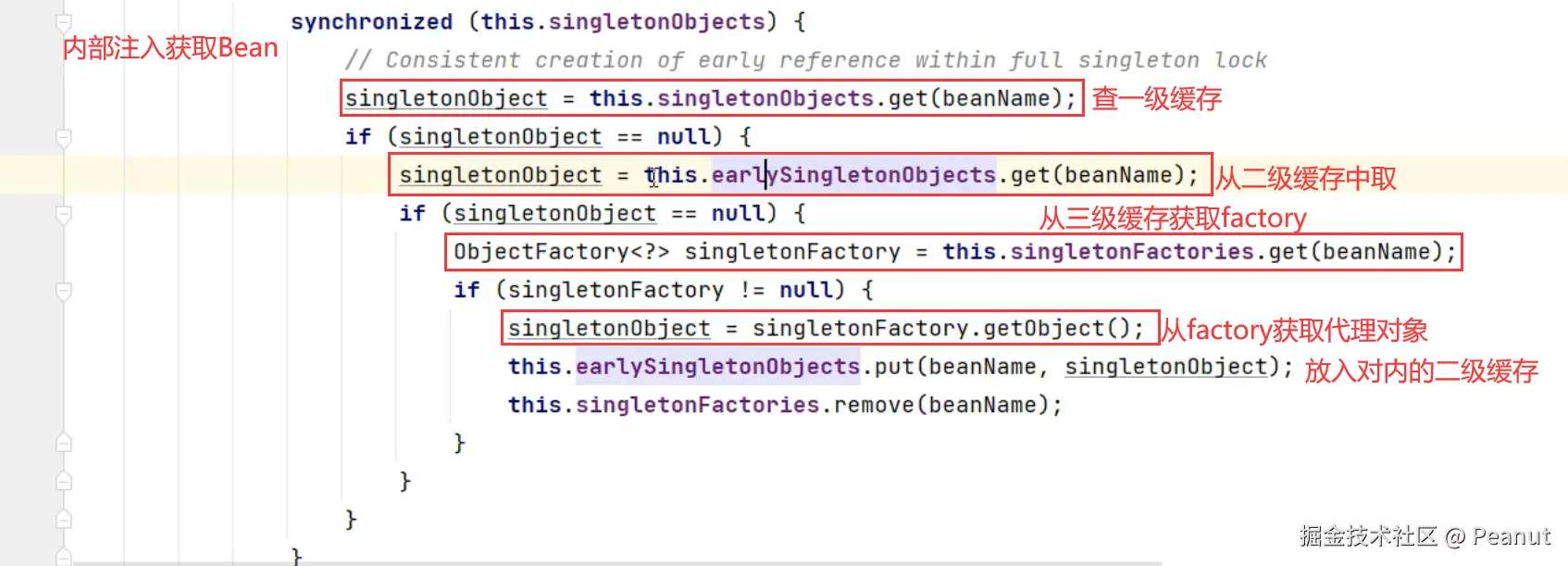- 后续在内部获取注入bean A时,在一级缓存找不到,二级缓存找不到,获取三级缓存的beanA的beanFactory,从beanFactory获取beanA的代理对象(如果不需要代理工厂就返回目标对象) 后立马放入二级缓存,然后返回给内部调用者。后续内部获取bean都从二级缓存获取代理对象。