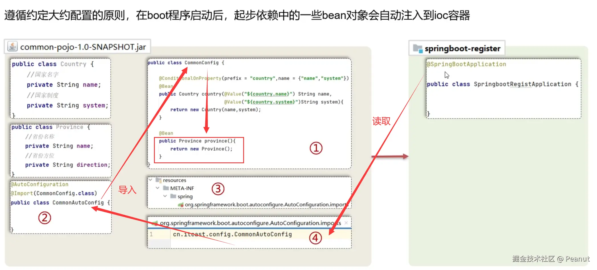 - 在jar包中声明需要注入的bean,然后jar包中写一个configuration配置类,通过 @bean 注入自己想注入的自定义类。(这时配置类不生效)
