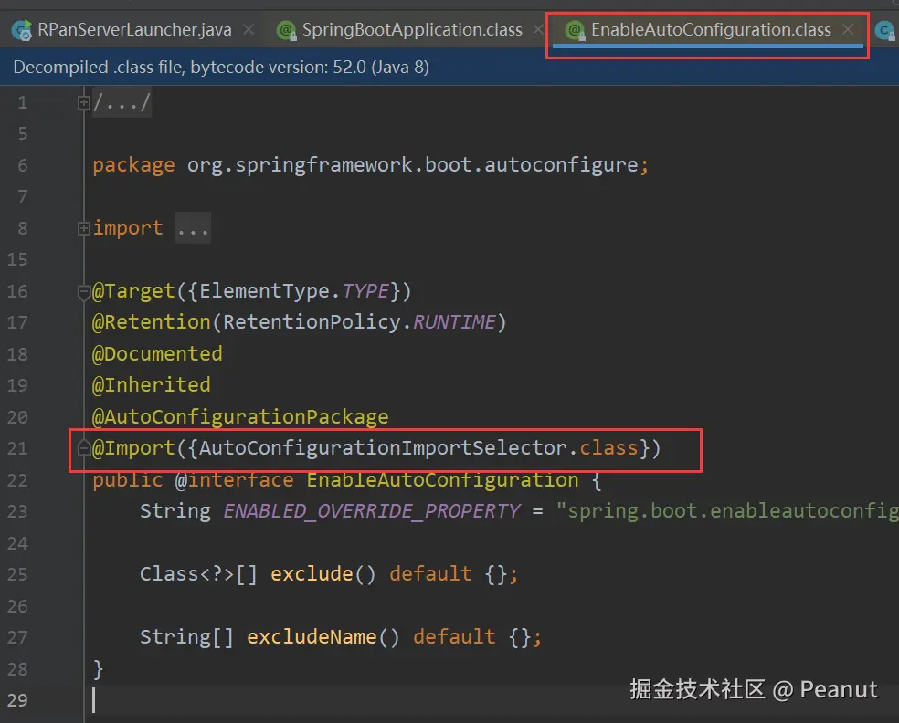 - @EnableAutoConfiguration注解中组合了@Import注解, @Import注解导入了AutoConfigurationImportSelector选择器类。