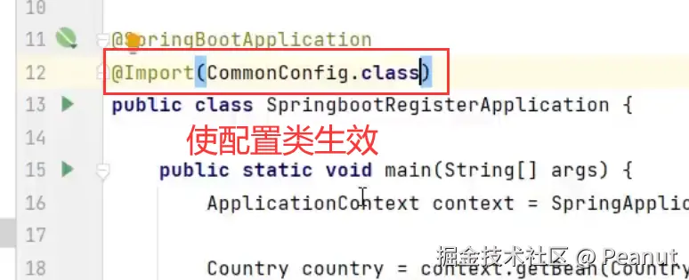 - 导入配置类(当configuration配置类不在springboot包扫描范围内时,可以在启动类通过import注解导入configuration配置类,使其生效。)