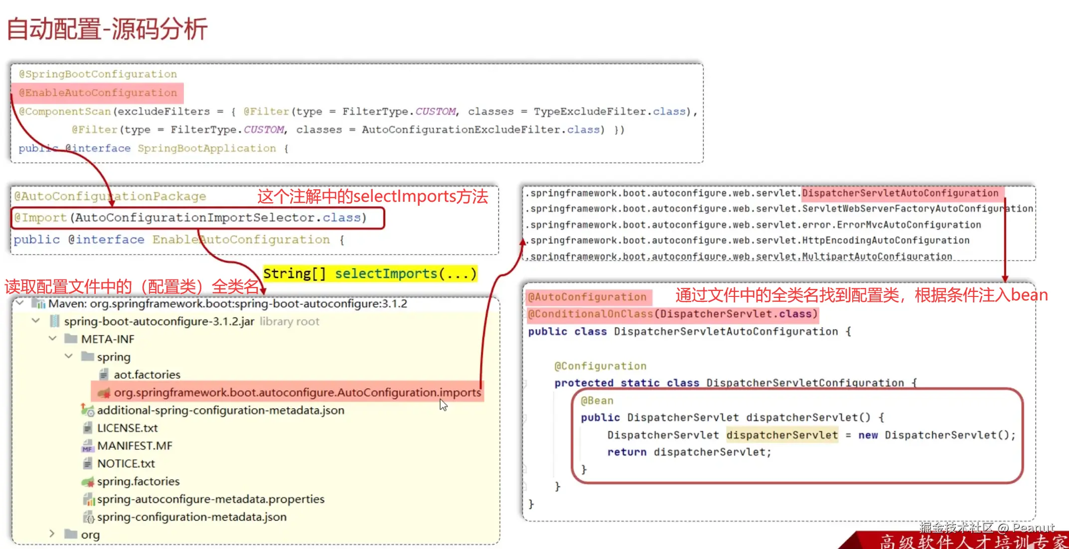 第三个,springboot拿到所有第三方jar包里面声明的配置类以后,再通过Spring提供的lmportSelector这样一个接口(@Import注解功能) ,来实现对这些配置类的动态加载,从而去完成自动装配的动作。