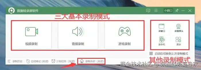 步骤2:进入软件主界面,您可以根据需求选择不同的录制模式,还能对录制水印进行自定义的设置。这里将以 【视频录制】 作为演示。