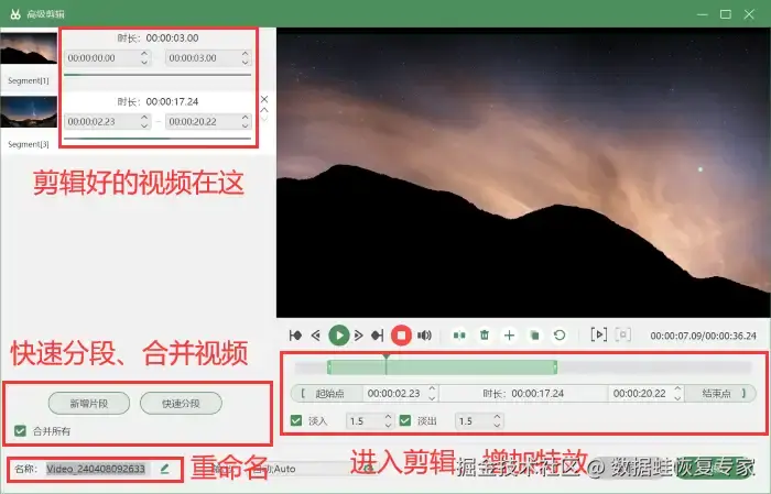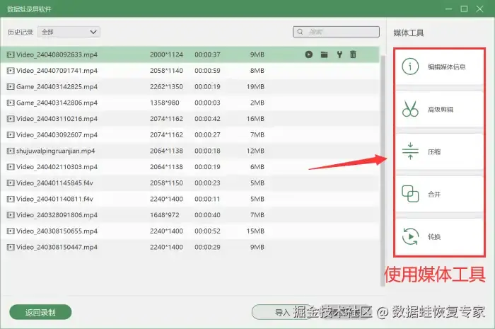 步骤4:视频录制完成后,您可以进入 【高级剪辑】 中对视频进行分段、剪辑、增加特效等操作。如果您对视频需要更多的设置,可以在 【历史记录】 中使用媒体工具对视频进行压缩、合并、格式转换等操作。