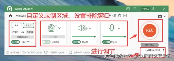 步骤3:在 【视频录制】 界面您可以自定义录制区域、设置排除窗口;录屏怎么把声音录进去?这时需要您对摄像头、麦克风等进行调节,确保您录制的视频有声音。您还能在录制中使用高级录制模式。设置完毕点击 【REC】 即可进入录屏。