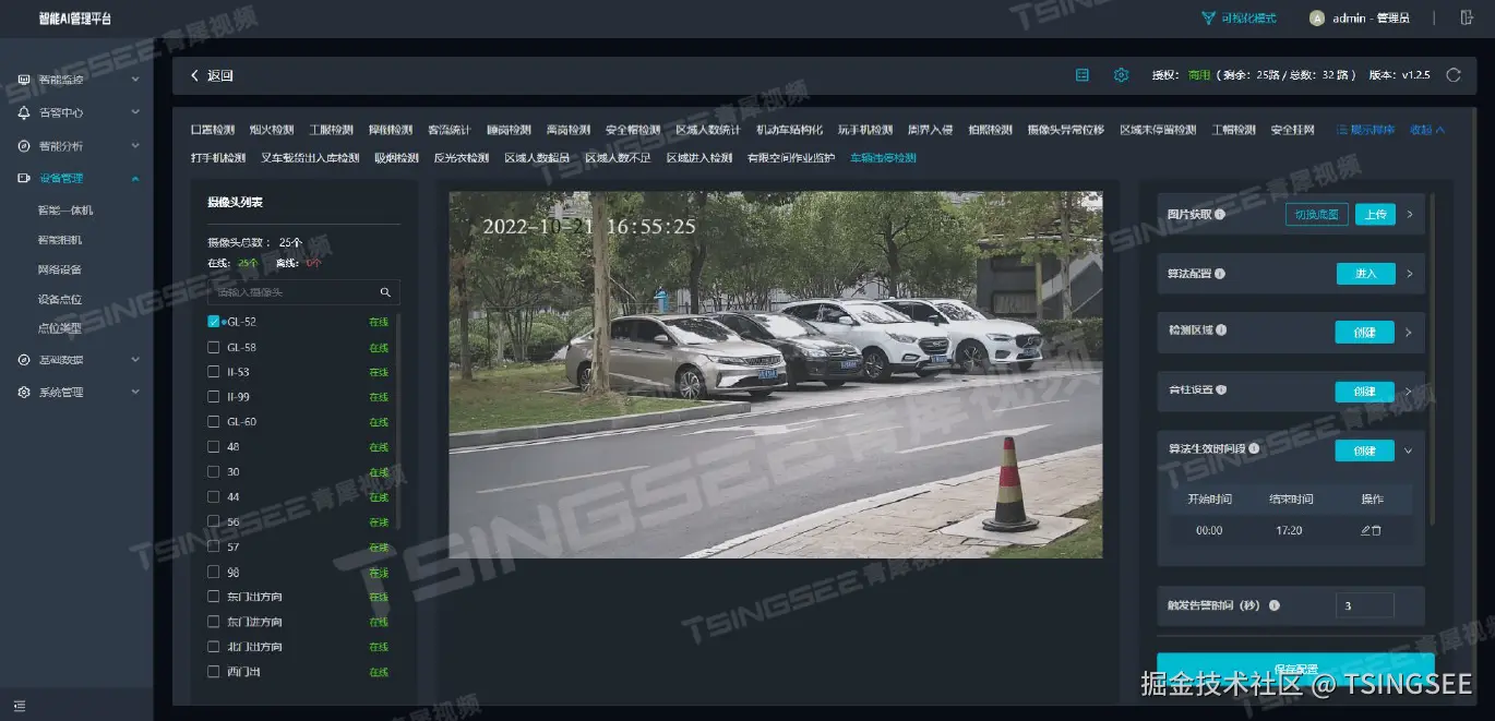**3)园区管理:**在企业园区、学校、社区等区域,车辆违停问题可能导致安全隐患和交通拥堵。通过部署车辆违停检测AI算法,实现对园区内车辆的实时监控和管理。系统可自动检测违停车辆并生成告警信息,通知管理人员及时处理。