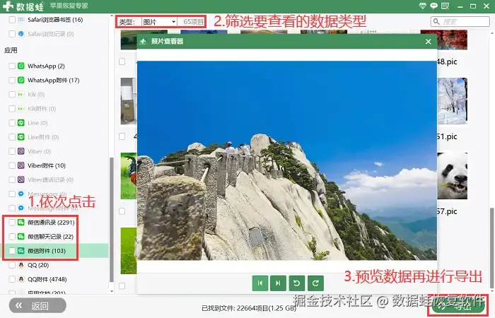 步骤4:预览并勾选您不小心清理的微信数据,点击【导出】按钮即可。