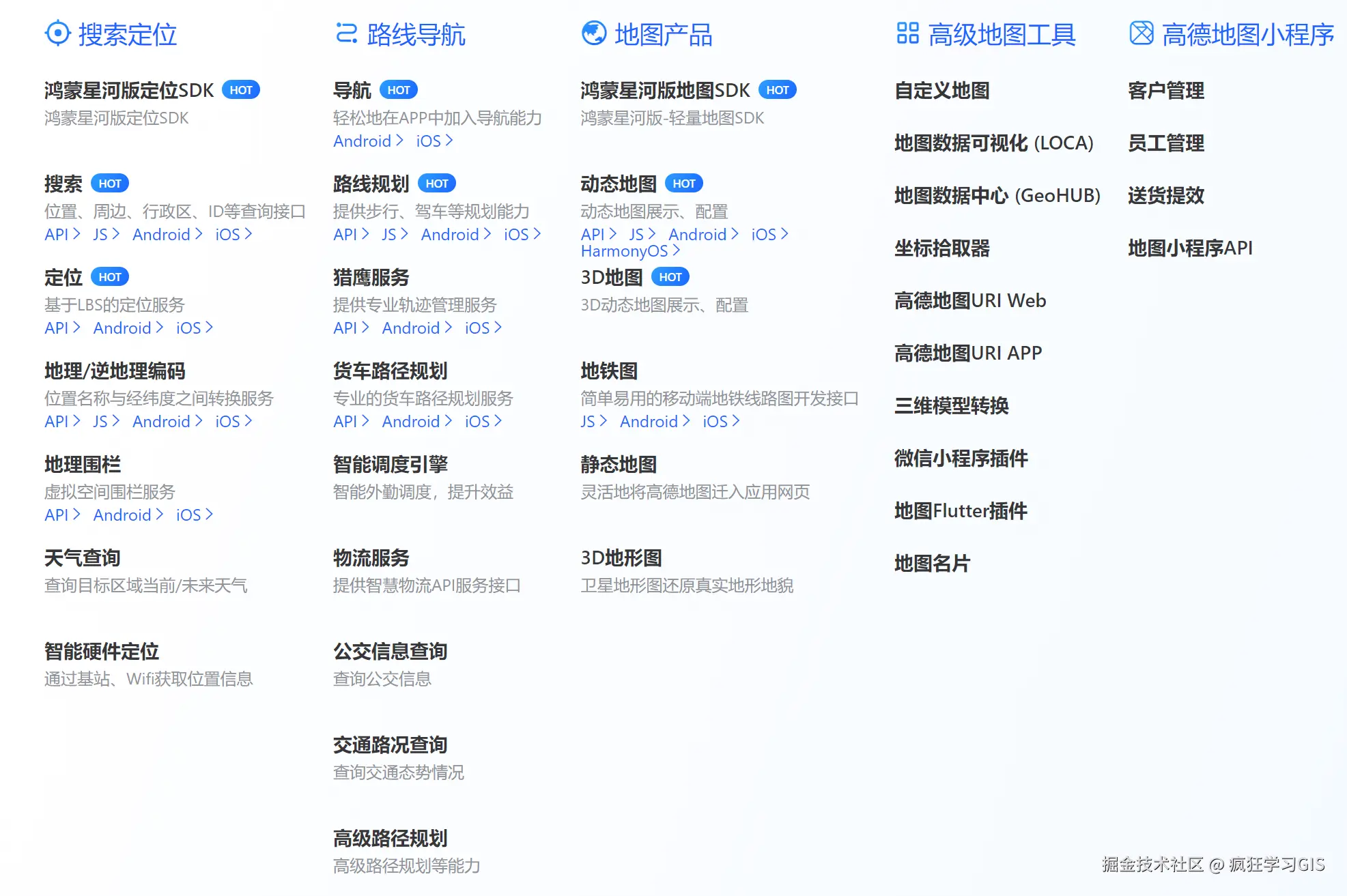 此外,高德地图开放平台亦是本文所列举全部地图API服务中,唯一一个将地理编码、天气查询、卫星地图等服务放在平台首页中展示的。当然,这些需求都是相对比较简单的——例如,地理编码是地图搜索、导航等应用中一定会使用的基本操作,卫星地图也是各家图商都有所提供的服务,而天气查询相当于就是接口套接口,相对实现也并不难。但是,正是其将这些比较基本的API功能放在首页展示,亦从一定角度表明其对于基础地图开发人员的友好性,或许也能说明高德对于一般的地图开发而言更加适合。
