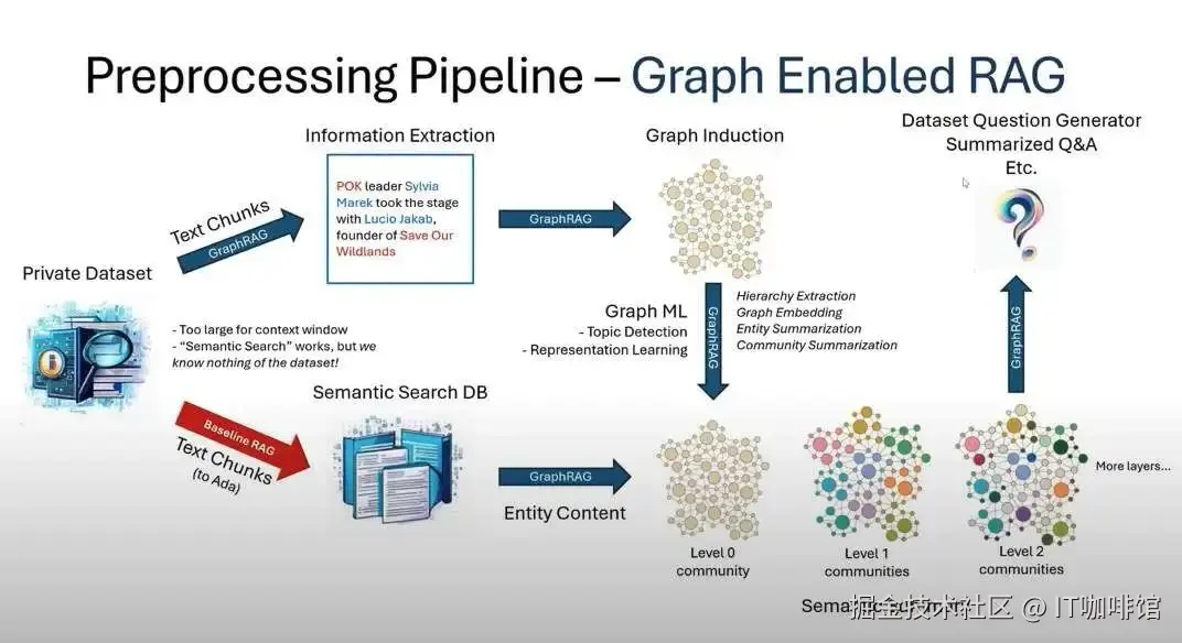 - 自动化的知识抽取: GraphRAG 利用 LLM 自动从文本数据中抽取实体、关系和关键陈述等信息,无需人工构建知识图谱,大大降低了知识图谱构建的成本和难度。