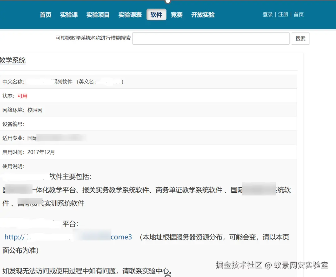 进行信息搜索(你得有一套自己的信息搜集逻辑吧,不然连这个系统都找不到)后,找到一处教学管理系统,点击页面上方软件,点击蓝色链接,进入教学系统