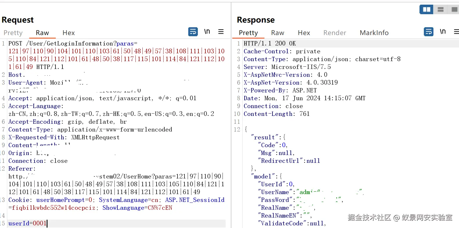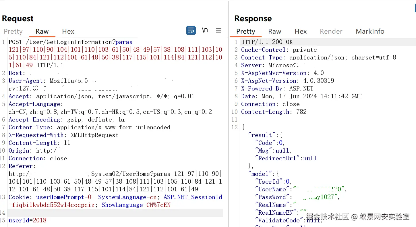 发现此处展现了我的账户,密码等个人信息,且数据包body较为简单,于是将数据包转到repeater进行测试。将userId改为2018发包,发现返回其他用户信息。