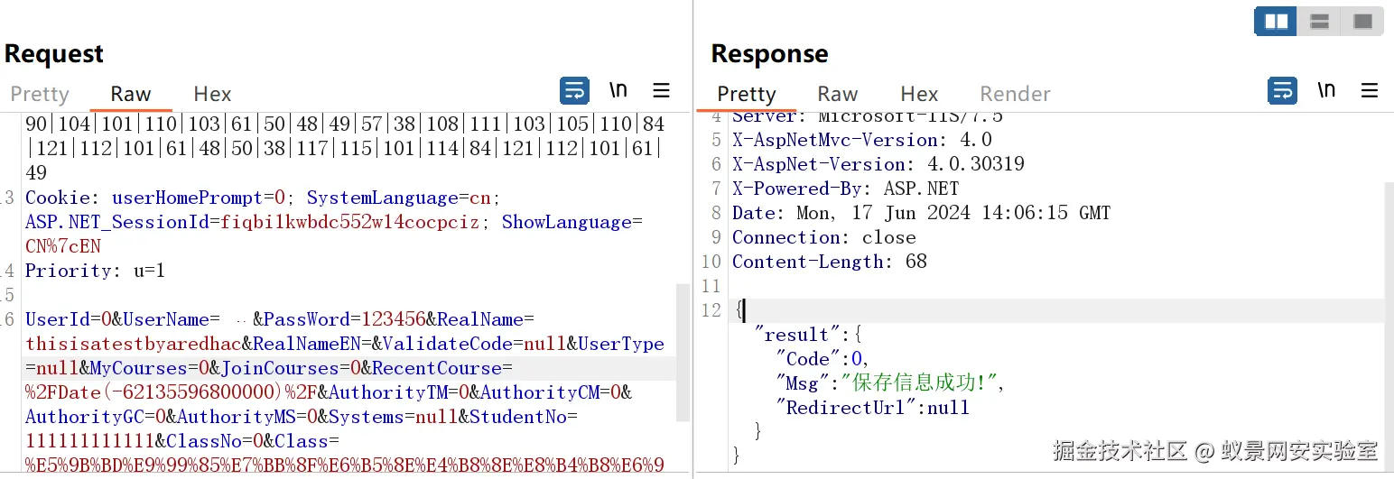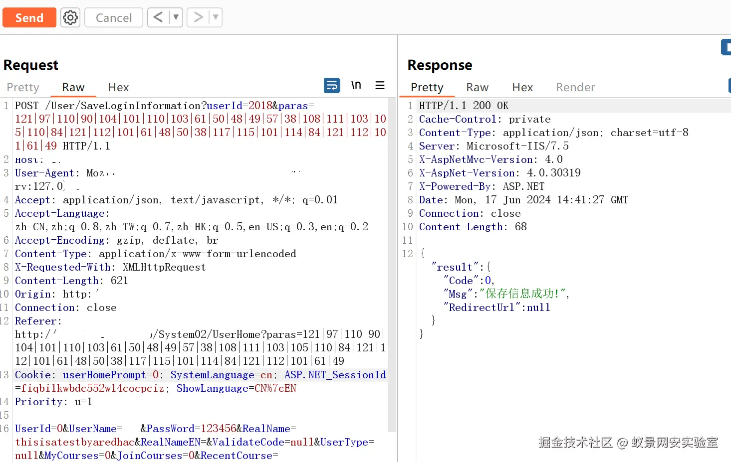 继续查看先前的历史数据包,找到保存信息那一个数据包。将其发送到repeater模块进行分析。